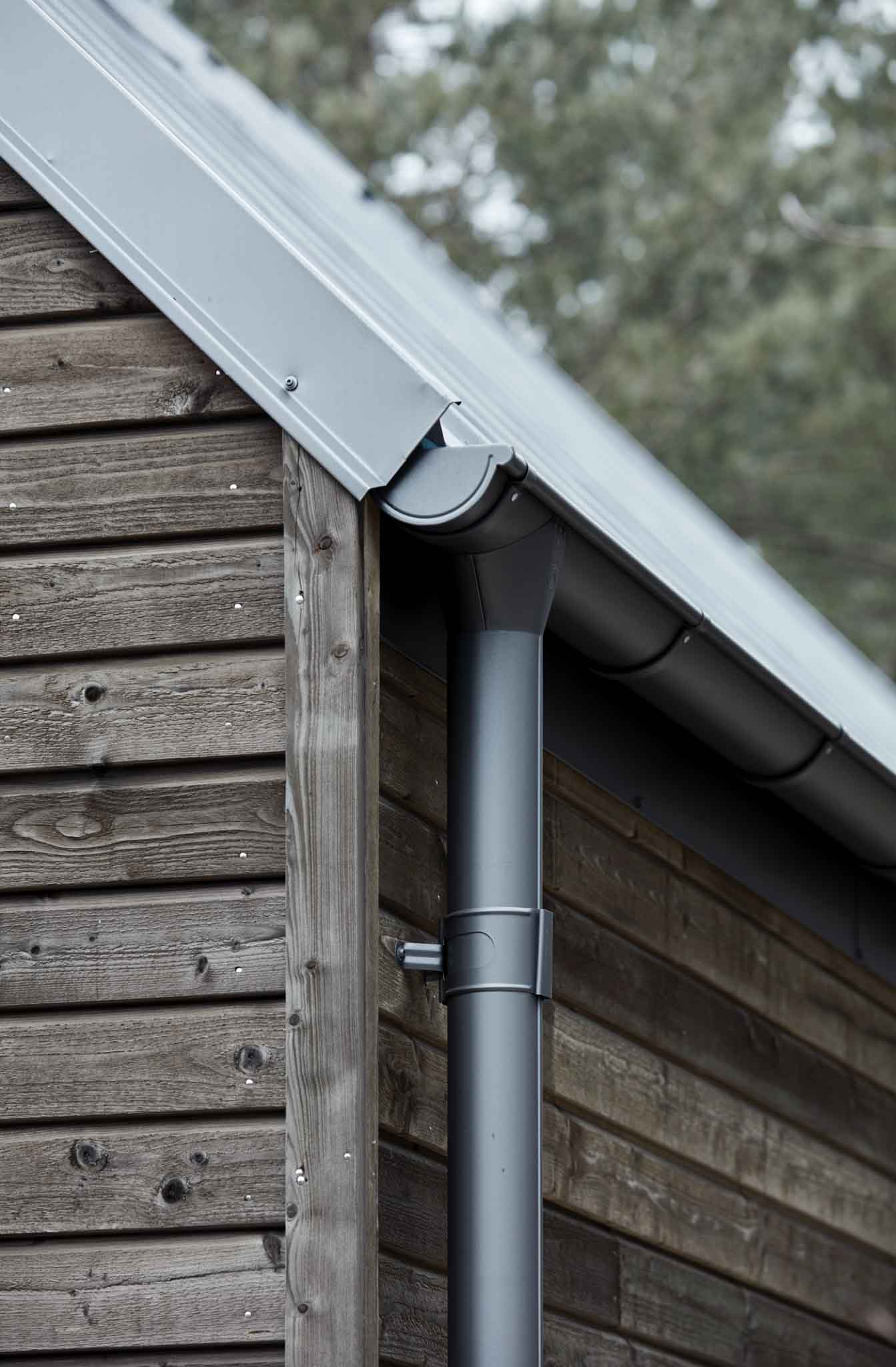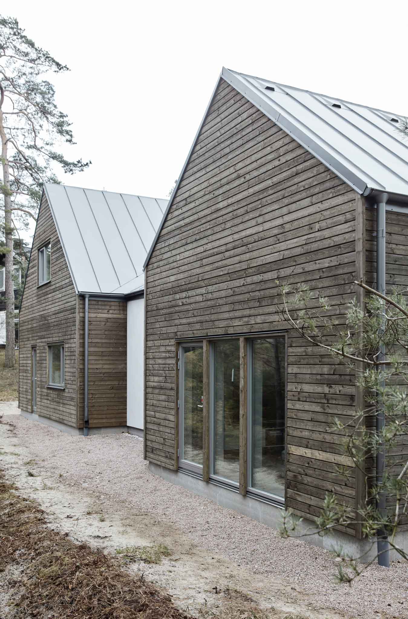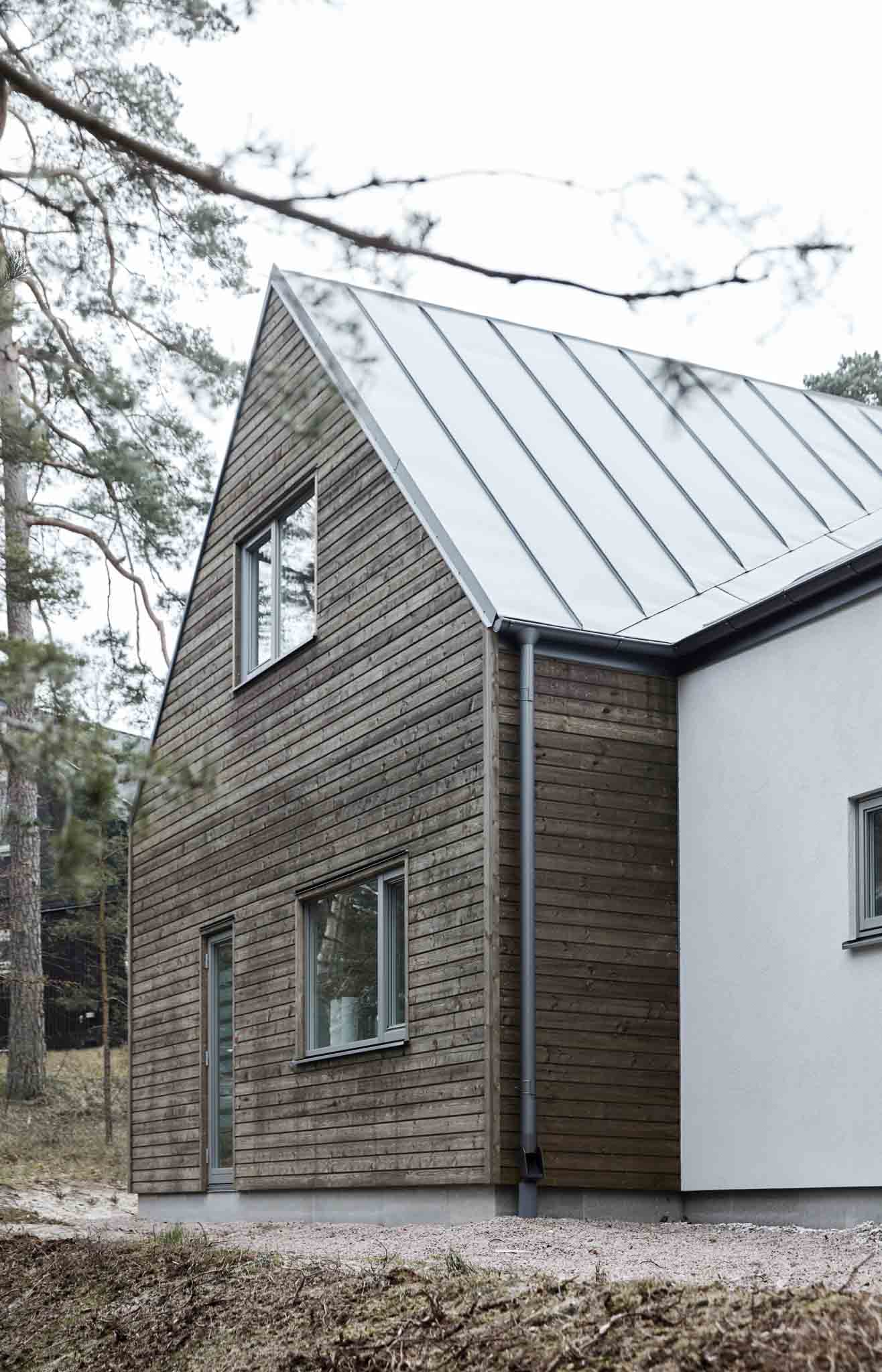 En kundunik villa med liggande panel i järnvitriol som möter en mittdel i puts – en kombination som skapar en stilren kontrast. Det grå plåttaket och de foderlösa detaljerna ger huset en modern känsla, samtidigt som helheten känns tidlös och elegant. Beläget i Åhus, Skåne.